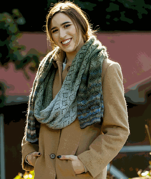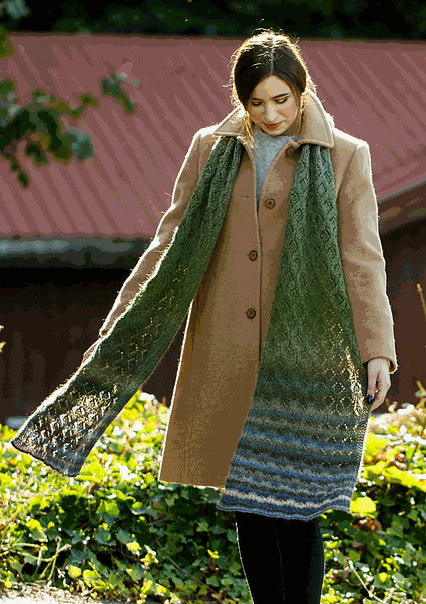 Patty has designed a generous scarf/wrap with a textural stitch pattern especially for our Evolution yarn. This soft merino yarn has a next-to-the-skin softness and a pretty self-striping sequence. With its versatility and huge cuddle factor, this wrap just might become your next treasured project. This single-ply yarn transitions from slower color change to more rapid ones, for a great ombré effect. The lace pattern is charted and written out.This project is worked in two sections that are joined either with a three-needle bind-off or by grafting in Kitchener stitch. There is also an alternate construction method for those who want to avoid the center join.Needle size: US 7 - 4.5 mm Finished dimensions approx. 68" x 15.5"Your kit includes the pattern and 2 generous skeins of Evolution yarn $46Choose one of the pretty colorways shown