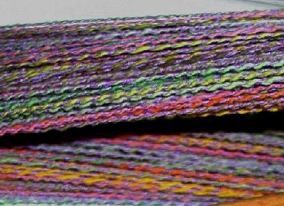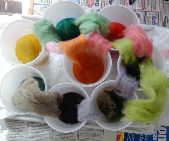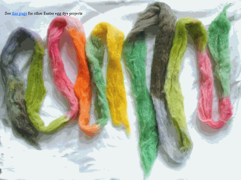 I soaked wool roving in a vinegar solution, squeezed out most of the water, then draped 2 continuous sections, about 3 yds total, into plastic cups of leftover dye, and left them overnight. In the morning there were still some undyed sections between the cups (I had thought there would be more bleeding), so I shifted the rovings and left them for the day. The results were good, so I spun a singles yarn, about 16 wpi. Since there was no purple in this colorway, I decided to ply the singles with a raw silk that color and am happy with the result. About 200 yds.